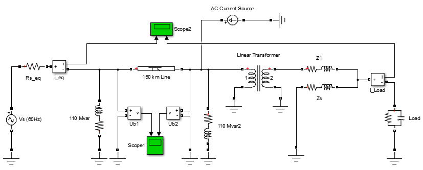 Для измерения зависимости импеданса от частоты в том же узле, где подключен блок измерения импеданса, необходим источник тока, обеспечивающий второй вход в модель состояния-пространства. Добавьте в модель блок источника переменного тока из библиотеки Simscape > Electrical > Specialized Power Systems > Fundamental Blocks > Electrical Sources. Подключите этот источник, как показано ниже. Установить величину источника тока в нуль и поддерживать его частоту на уровне 60 Hz.