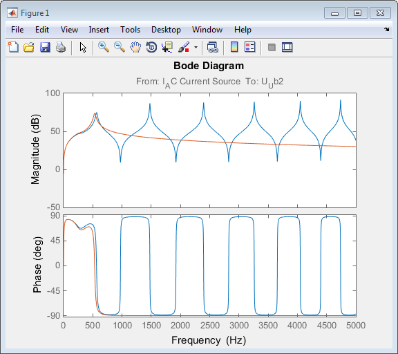 В блоке Simscape Electrical Specialized Power Systems был автоматизирован процесс измерения импеданса цепи из модели состояния-пространства (который подробно описан в следующем разделе «Получение отношения импеданса к частоте из модели состояния-пространства»). В power_gui примере модели два блока измерения импеданса powerlib измеряют импеданс в двух точках модели. Удалите блок B3 импеданса и снова подключите B1 импеданса, как показано на рисунке.