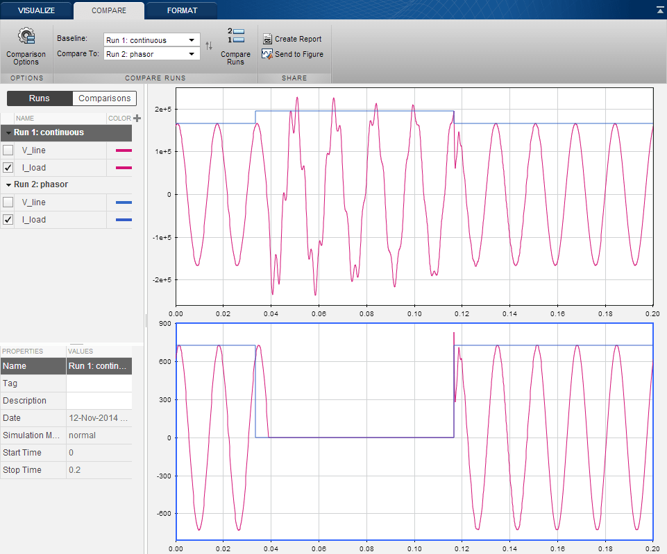Перезапустите моделирование. Откройте инспектор данных моделирования. Формы волн, полученные при непрерывном моделировании и фазорном моделировании, накладываются на этот график.