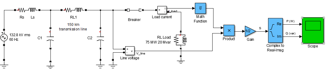 Эта схема представляет собой упрощенную модель 60 Гц, 230-kV трехфазной энергосистеме, где представлена только одна фаза. Эквивалентный источник моделируется источником напряжения (230 кВ RMS/sqrt (3) или 132,8 кВ RMS, 60 Гц) последовательно с его внутренним импедансом (Rs Ls). Источник подает нагрузку RL через 150-км линию передачи, смоделированную одной секцией PI (ответвление RL1 и две шунтирующие емкости C1 и С2). Автоматический выключатель используется для переключения нагрузки (75 МВт, 20 Мвар) на приемном конце линии передачи. Для контроля напряжения и тока нагрузки используются два измерительных блока.