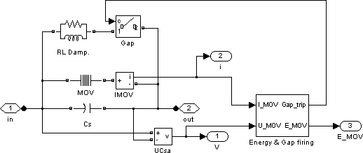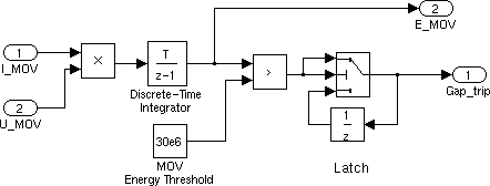 Параллельно блоку MOV также соединен зазор. Зазор воспламеняется, когда энергия, поглощаемая разрядником, превышает критическое значение 30 МДж. Для ограничения скорости нарастания тока конденсатора при обжиге зазора последовательно подключают демпфирующую RL-цепь. Откройте подсистему зажигания Energy & Gap. Он показывает, как вычисляется энергия, рассеиваемая в MOV, интегрируя мощность (произведение напряжения MOV и тока).