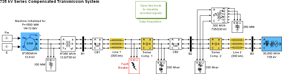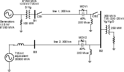 Показанная здесь однолинейная схема представляет трехфазную, 60 Гц, 735 кВ энергосистему, передающую мощность от электростанции, состоящей из шести генераторов 350 МВА, в эквивалентную систему через линию передачи 600 км. Линия электропередачи разделена на две линии протяженностью 300 км, соединенные между автобусами B1, B2 и B3.