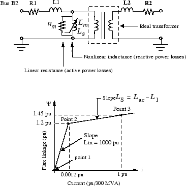 Характеристика «поток-ток» аппроксимируется двумя сегментами, показанными на графике. Точка насыщения колена составляет 1,2 pu. Первый сегмент соответствует намагничивающей характеристике в линейной области (для потоков ниже 1,2 pu). При напряжении 1 pu индуктивный намагничивающий ток составляет 0,0010/1,0 = 0,001 pu, что соответствует 0,1% потерь реактивной мощности.