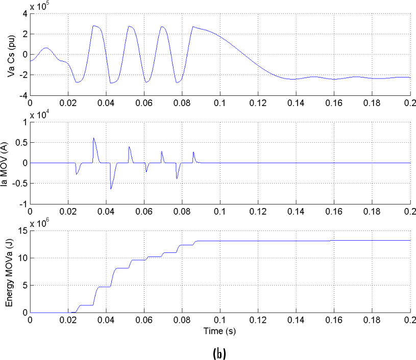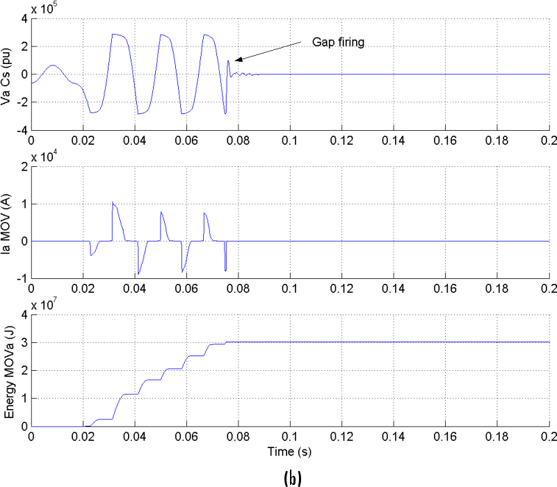 Следует отметить, что во время отказа энергия, рассеиваемая в MOV (b: trace 3), накапливается быстрее, чем в случае отказа линии-земля. Энергия достигает порогового уровня 30 МДж после трех циклов, за один цикл до открытия линейных выключателей. В результате зазор воспламеняется, и напряжение конденсатора (b: trace 1) быстро разряжается до нуля через схему демпфирования.