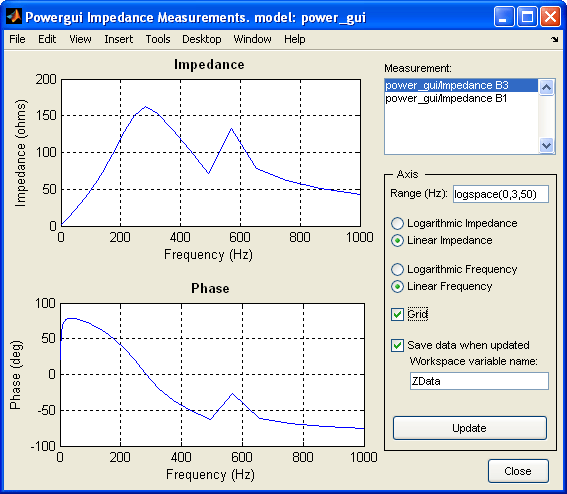В блоке Powergui выберите «Измерение импеданса». Откроется новое окно с именем блока измерения импеданса. Заполните диапазон частот путем ввода 0:500. Выберите линейные масштабы для отображения графика величины Z и частоты. Нажмите кнопку Сохранить данные в рабочей области и введите Zcase1 в качестве имени переменной, содержащей импеданс или частоту. Нажмите кнопку «Показать».