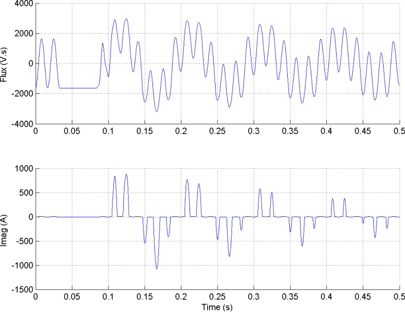 При устранении неисправности, когда напряжение восстанавливается, трансформатор приводится в состояние насыщения в результате смещения потока, создаваемого компонентами напряжения 60 Гц и 9 Гц. Импульсы тока намагничивания трансформатора появляются, когда поток превышает свой уровень насыщения. Этот ток содержит реактивный компонент 60 Гц, модулированный при 9 Гц.