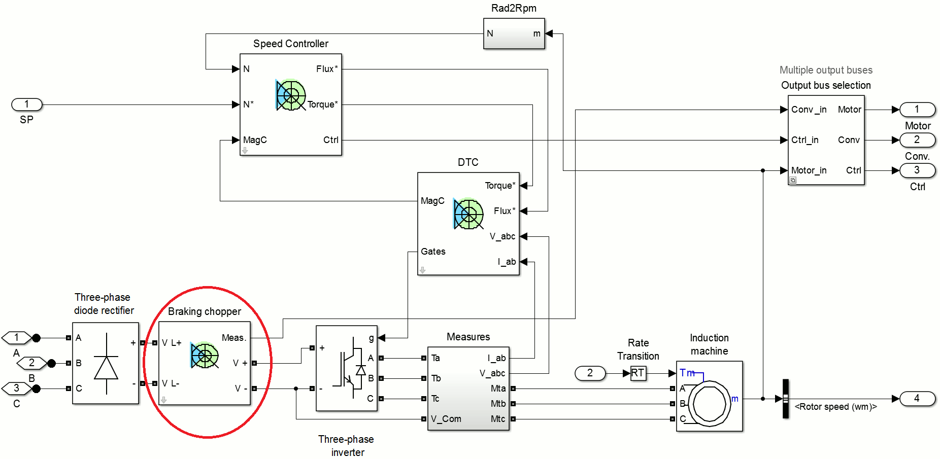 Трехфазный инвертор системы ДТК питается напряжением постоянного тока, вырабатываемым трехфазным диодным выпрямителем. Конденсатор, расположенный на выходе выпрямителя, уменьшает пульсации напряжения шины постоянного тока. Между блоком выпрямителя и блоком инвертора также был добавлен блок прерывателя торможения, чтобы ограничить напряжение шины постоянного тока, когда двигатель подает обратную энергию на привод (показано ниже). Эта энергия рассеивается через сопротивление, когда напряжение шины постоянного тока слишком велико.