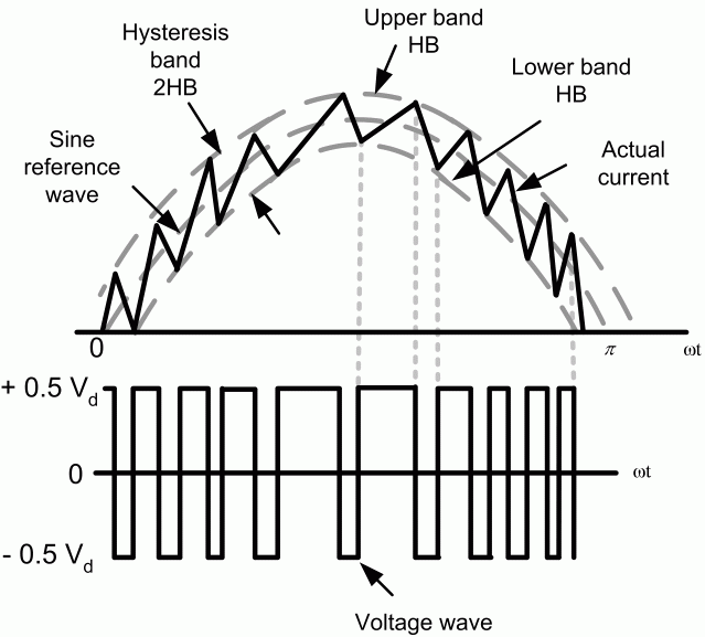 Гистерезисная модуляция представляет собой способ управления током обратной связи, в котором ток двигателя отслеживает опорный ток в пределах полосы гистерезиса. На следующем рисунке показан принцип работы гистерезисной модуляции. Контроллер генерирует синусоидальный опорный ток желаемой величины и частоты, который сравнивается с фактическим током линии двигателя. Если ток превышает верхний предел полосы гистерезиса, верхний выключатель рычага инвертора выключается, а нижний выключатель включается. В результате ток начинает распадаться. Если ток пересекает нижнюю границу полосы гистерезиса, нижний выключатель рычага инвертора выключается, а верхний выключатель включается. В результате ток возвращается в полосу гистерезиса. Следовательно, фактический ток вынужден отслеживать опорный ток в пределах полосы гистерезиса.