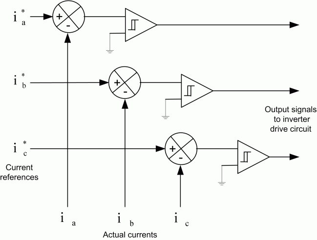 На следующем рисунке показана схема модуляции управления током гистерезиса, состоящая из трех компараторов гистерезиса, по одному для каждой фазы. Этот тип ШИМ с замкнутым контуром используется в моделях AC3 и AC5.