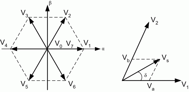 Переключение SA, SB, SC приводит к восьми состояниям инвертора. Состояния переключения и соответствующие напряжения от фазы к нейтрали суммированы в таблице, в которой перечислены состояния, операции инвертора и векторы пространственного напряжения. Шесть активных векторов расположены на расстоянии 60 градусов друг от друга и описывают шестиугольную границу. Два нулевых вектора находятся в начале координат.