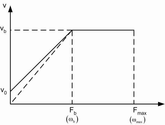 Поскольку двигатель питается переменным напряжением и частотой источника переменного тока, важно поддерживать постоянную V/Гц в области постоянного крутящего момента, чтобы избежать магнитного насыщения. Типичная характеристика V/Гц показана ниже. Обратите внимание, что прямая линия имеет небольшое увеличение напряжения, чтобы компенсировать падение сопротивления на низкой частоте. Система управления V/HZ с разомкнутым контуром используется в системах с низкой динамикой, таких как насосы или вентиляторы, где допускается небольшое изменение частоты вращения двигателя с нагрузкой. Модель AC1 основана на контроллере V/Hz с разомкнутым контуром.
