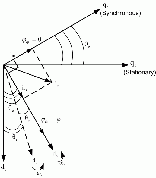 Ориентированное на поле управление подразумевает, что ids-компонент тока статора будет выровнен с полем ротора, а iqs-компонент будет перпендикулярен ids. Это может быть достигнуто путем выбора в качестве скорости потока ротора и фиксации фазы системы опорной рамы так, чтобы поток ротора был точно выровнен с осью d, что приводит к