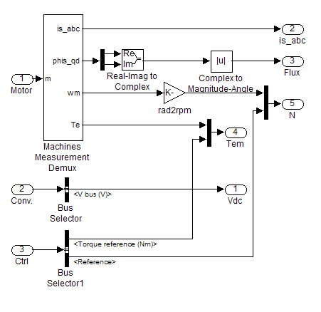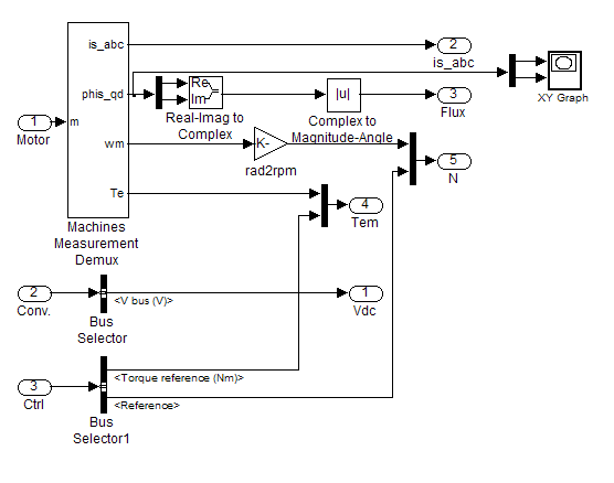 Все значения переменных двигателя можно считывать с помощью вектора Motor. Вектор Conv. содержит все данные, связанные с преобразователем. Вектор Ctrl включает все опорные сигналы и другие управляющие значения.
