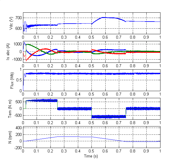 Обратите внимание на быструю реакцию двигателя на изменение уставки крутящего момента. С 0,02 с до 0,25 с скорость вентилятора увеличивается из-за момента ускорения 600 Н· м, создаваемого асинхронным двигателем. При t = 0,25 с электромагнитный крутящий момент падает до 0 Н· м, и скорость уменьшается из-за крутящего момента нагрузки, противоположного вентилятору. При t = 0,5 с крутящий момент двигателя развивает крутящий момент -600 Н.м и допускает торможение вентилятора. Во время режима торможения питание посылается обратно на шину постоянного тока, и напряжение шины увеличивается. Как и планировалось, тормозной рубильник ограничивает напряжение шины постоянного тока до 700 В. При t = 0,75 с электромагнитный крутящий момент возвращается к 0 Н· м, и скорость колеблется около -10 об/мин и уменьшается до 0 об/мин. Обратите внимание, что поток остается около 0,8 Wb на протяжении всего моделирования. Амплитуды колебаний потока и крутящего момента несколько выше 0,02 Вт и 10 Н· м, соответственно, как указано в пользовательском интерфейсе. Это обусловлено совокупными эффектами времени выборки контроллера DTC 15 мкс, управления гистерезисом и ограничения частоты переключения.