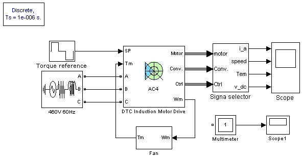 Добавьте блок привода асинхронного двигателя DTC из библиотеки Simscape > Electrical > Specialized Power Systems > Electric Drives > AC Drives в ac_example окно.