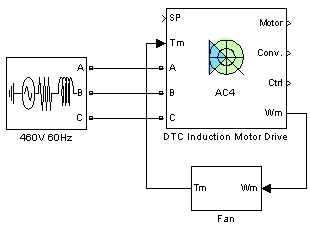 Пример иллюстрирует использование модели AC4 с параметром асинхронного двигателя мощностью 200 л.с., установленным во время регулирования крутящего момента. Блок AC4 моделирует диск DTC. Во время этого примера двигатель подключают к вентилятору и моделируют его реакцию на этапы крутящего момента.