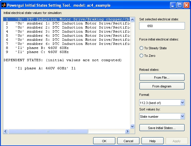 Откройте инструмент начальных состояний блока powergui. Установите Uc_DTC Induction Motor Drive/Braking chopper/Cbus значение для 650 V. Нажмите кнопку Применить, а затем Закрыть.