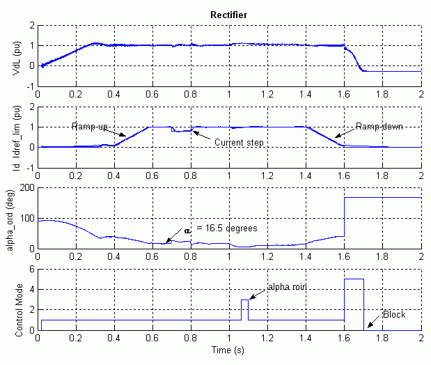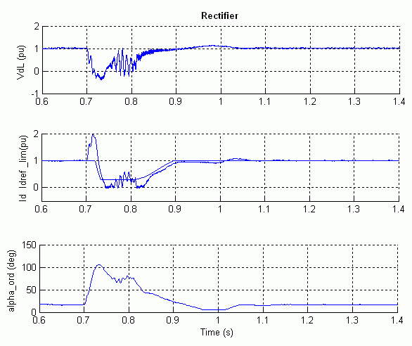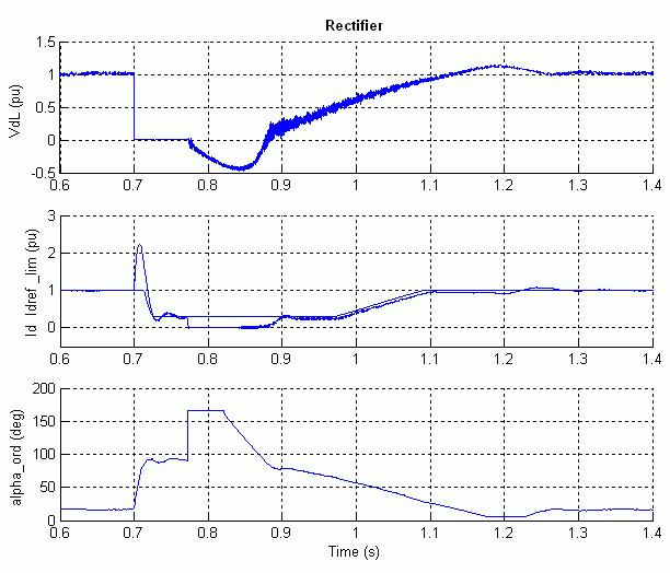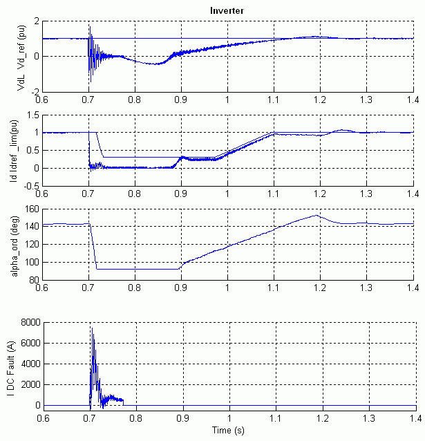 При подаче отказа (t = 0,7 с) постоянный ток увеличивается до 2,2 pu, а напряжение постоянного тока падает до нуля на выпрямителе. Это падение напряжения постоянного тока наблюдается с помощью ограничителя зависимого от напряжения тока (VDCOL) и защиты от отказа постоянного тока. VDCOL уменьшает опорный ток до 0,3 pu на выпрямителе. Постоянный ток продолжает циркулировать в случае неисправности. Затем при t = 0,77 с угол срабатывания выпрямителя α принудительно доводится до 166 градусов защитой от отказа постоянного тока после обнаружения низкого напряжения постоянного тока. Выпрямитель теперь работает в инверторном режиме. Напряжение в линии постоянного тока становится отрицательным, и энергия, накопленная в линии, возвращается в систему переменного тока, вызывая быстрое истечение тока повреждения при следующем пересечении нуля. Затем α освобождается при t = 0,82 с и нормальное напряжение постоянного тока и ток восстанавливаются приблизительно за 0,5 с. Обратите внимание, что временное изменение режима в выпрямителе управляет от 1,18 с до 1,25 с.
