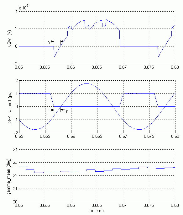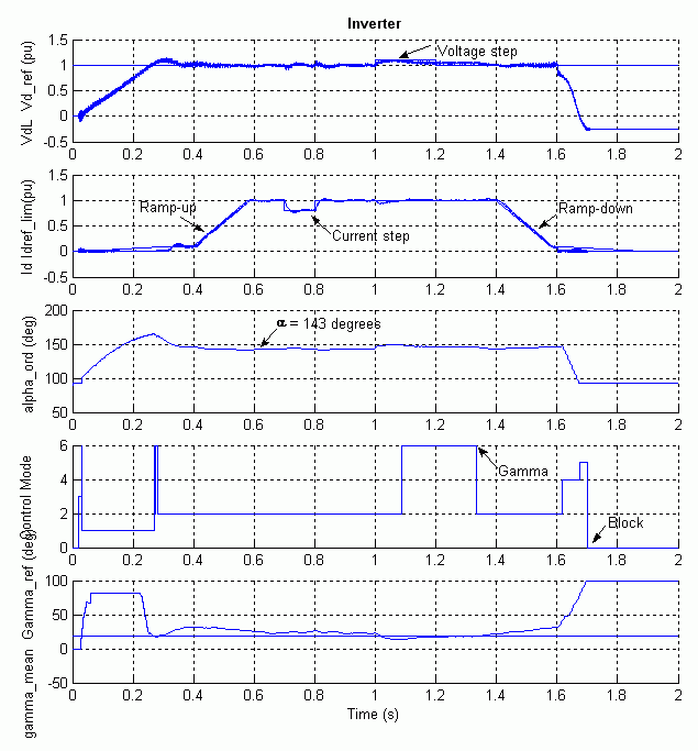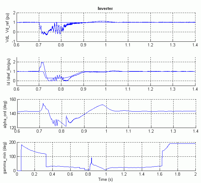При t = 0,7 с шаг -0,2 pu применяется в течение 0,1 с к опорному току, чтобы можно было наблюдать динамическую реакцию регуляторов. Затем, при t = 1,0 с, в течение 0,2 с на опорное напряжение инвертора подается шаг 0,1 pu. Обратите внимание, что в инверторе угол затухания достигает эталонного значения (например, минимально допустимого значения) и что регулятор Гамма принимает управление при t около 1,1 с. При t около 1,3 с регулятор напряжения снова осуществляет управление напряжением.