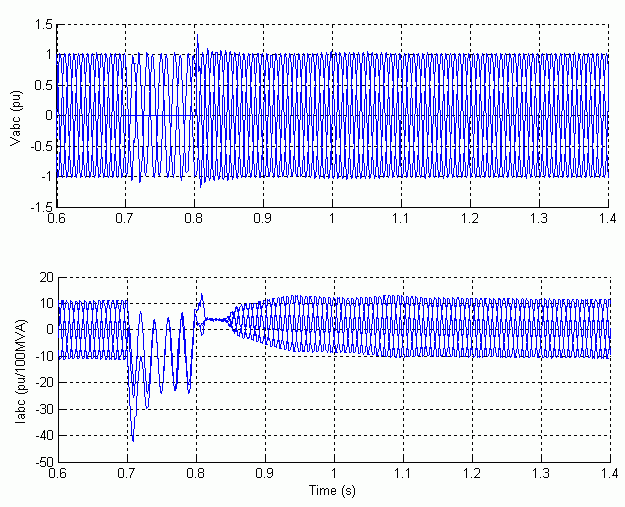 Обратите внимание на колебания 120 Гц в напряжении постоянного тока и токах во время сбоя. Неизбежный сбой коммутации происходит в инверторе в самом начале неисправности, и постоянный ток увеличивается до 2 pu. Отказ коммутации является результатом отказа входного клапана принять постоянный ток до того, как напряжение коммутации изменит свою полярность. Симптомами являются нулевое напряжение постоянного тока на пораженном мосту, вызывающее увеличение постоянного тока со скоростью, определяемой главным образом индуктивностью цепи постоянного тока. Когда неисправность устраняется при t = 0,8 с, VDCOL работает и уменьшает опорный ток до 0,3 pu. Система восстанавливается приблизительно через 0,35 с после устранения неисправности.