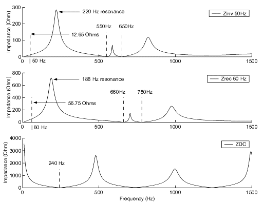 Обратите внимание на два минимальных значения импеданса для Z систем переменного тока. Эти последовательные резонансы создаются фильтрами 11-й и 13-й гармоник. Они возникают при 660 Гц и 780 Гц в системе 60 Гц. При этом добавление емкостных фильтров 600 Мвар на индуктивных системах создает резонансы около 188 Гц на стороне выпрямителя и 220 Гц на стороне инвертора. В области 60 Гц величина равна 56,75 Ом для системы 60 Гц, что соответствует эффективному уровню короткого замыкания 5002/56,75 = 4405 МВА на стороне выпрямителя (5000 МВА - 600 Мвар фильтров).