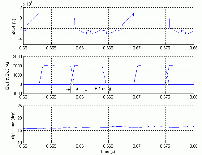 Система запрограммирована на запуск и достижение устойчивого состояния. Затем сначала применяется шаг к опорному току, а затем к опорному напряжению, чтобы можно было наблюдать динамический отклик регуляторов. Наконец, инициируется последовательность остановок для плавного снижения передачи мощности перед блокированием преобразователей. Обратите внимание в контроллере преобразователя, что после приема сигнала остановки Forced_alpha упорядочивается на 0,150 с, а затем на 0,1 с позже упорядочивается блокировка импульсов.