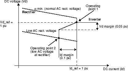 При нормальной работе выпрямитель управляет током на Id_ref опорное значение, тогда как инвертор управляет напряжением или гамма при Vd_ref или Gamma_min ссылочное значение.