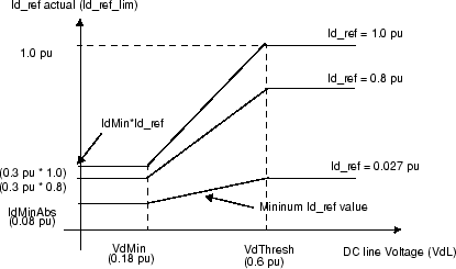 Id_ref значение начинает уменьшаться, когда напряжение линии Vd падает ниже порогового значения VdThresh. Фактический опорный ток, используемый контроллерами, доступен на втором выходе контроллера, названном Id_ref_lim. IdMinAbs - абсолютный минимум Id_ref значение. Когда напряжение в линии постоянного тока падает ниже VdThresh значение, VDCOL мгновенно падает до Id_ref. Однако, когда напряжение постоянного тока восстанавливается, VDCOL ограничивает Id_ref время нарастания с постоянной времени, определенной параметром Tup.
