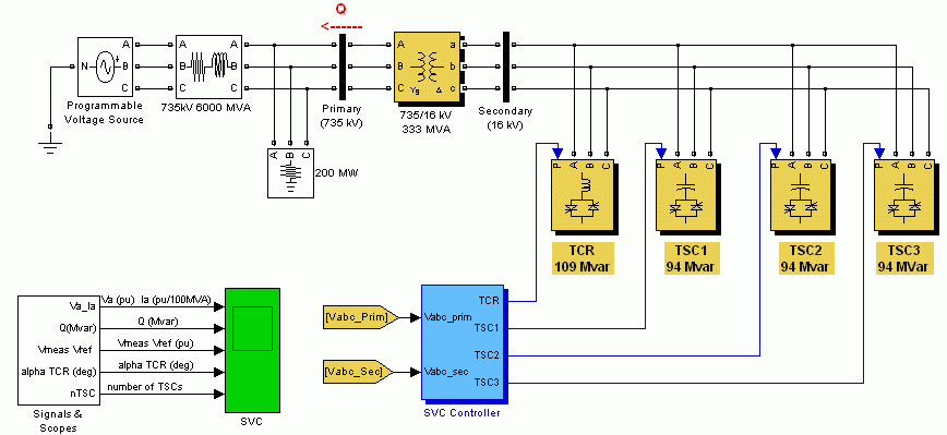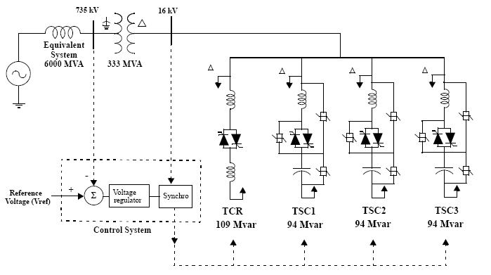 SVC состоит из трансформатора связи 735 kV/16 кВ, 333 MVA, одного блока TCR 109 Mvar и трех блоков TSC 94 Mvar (TSC1 TSC2 TSC3), подключенных на вторичной стороне трансформатора.