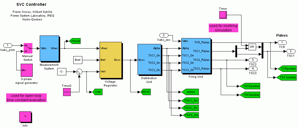 Модель SVC, описанная в этом примере, представляет собой довольно детальную модель конкретной топологии SVC (с использованием тиристорно-управляемого реактора (TCR) и тиристорно-коммутируемых конденсаторов (TSC)) с полным представлением силовой электроники. Этот тип модели требует дискретного моделирования на фиксированных временных шагах (в данном случае 50 мкс) и обычно используется для изучения производительности SVC в гораздо меньшем временном диапазоне (несколько секунд). Типовые применения включают оптимизацию системы управления, воздействие гармоник, переходных процессов и напряжений на силовые компоненты во время отказов.