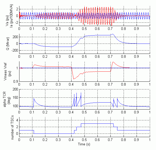 При t = 0,1 с напряжение внезапно увеличивается до 1,025 pu. SVC реагирует путем поглощения реактивной мощности (Q = -95 Mvar), чтобы вернуть напряжение к 1,01 pu. Время установки 95% составляет приблизительно 135 мс. На данный момент все TSC находятся в нерабочем состоянии, а TCR почти на полной проводимости (α = 94 градуса).