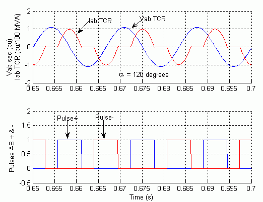 В этот момент три TSC находятся в рабочем состоянии, и TCR поглощает приблизительно 40% своей номинальной реактивной мощности (α = 120 градусов ).