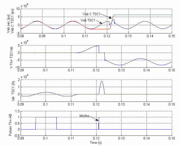 Обратите внимание, что импульс пропуска зажигания посылается, когда напряжение клапана является максимальным положительным сразу после блокировки TSC. Этот размыкание тиристора создает большой сверхток тиристора (в 18 кА или 6,5 раз больше номинального пикового тока). Также сразу после блокировки тиристора напряжение тиристора достигает 85 кВ (в 3,8 раза больше номинального пикового напряжения). Для предотвращения таких перетоков и перенапряжений тиристорные клапаны обычно защищены металлическими оксидными разрядниками (здесь не моделируются).