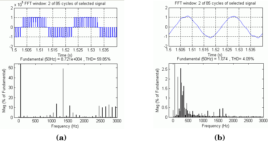 Главные гармонические напряжения генерируются на и вокруг кратных Р. Шунтирующие фильтры переменного тока имеют 27-й и 54-й высокие проходы, суммарно 40 Мвар. Чтобы проиллюстрировать действие фильтра переменного тока, мы провели анализ БПФ в установившемся состоянии напряжения фазы A преобразователя и напряжения фазы A шины фильтра, используя блок Powergui. Результаты показаны в анализе напряжения фазы А и БПФ: (a) Шина преобразователя (b) Шина фильтра.