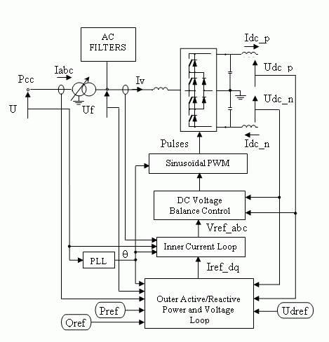 Блок регулятора реактивной мощности комбинирует PI-управление с управлением прямой связью для увеличения отклика на скорость. Во избежание срабатывания интегратора выполняются следующие действия: ошибка сбрасывается в ноль, когда измеренное напряжение РСС меньше постоянной величины (т.е. при возмущении переменного тока); когда выход регулятора ограничен, ошибка ограничения подается обратно с правым знаком на вход интегратора. Блок управления напряжением переменного тока, основанный на двух регуляторах PI, переопределяет регулятор реактивной мощности для поддержания напряжения PCC переменного тока в безопасном диапазоне, особенно в установившемся состоянии.