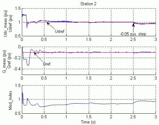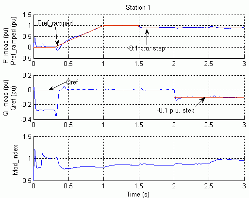 Преобразователь станции 2, управляющий напряжением постоянного тока, сначала разблокируется при t = 0,1. Затем станция 1, управляющая преобразователем активной мощности, разблокируется при t = 0,3 с и мощность медленно нарастает до 1 pu. Стационарное состояние достигается приблизительно на t = 1,3 с при напряжении постоянного тока и мощности 1,0 pu (200 кВ, 200 МВт). Оба преобразователя управляют потоком реактивной мощности до нулевого значения в станции 1 и до 20 Mvar (-0,1 pu) в системе станции 2.