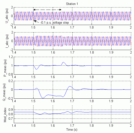 После достижения установившегося состояния на эталонную активную мощность в преобразователе 1 (t = 1,5 с) подается шаг -0,1 pu, а затем шаг -0,1 pu подается на эталонную реактивную мощность (t = 2,0 с). На станции 2 шаг -0,05 pu применяется к опорному напряжению постоянного тока. Наблюдается динамическая реакция регуляторов. Время стабилизации составляет приблизительно 0,3. Система управления пытается разъединить отклики активной и реактивной мощности. Обратите внимание на более или менее взаимное влияние регуляторов.