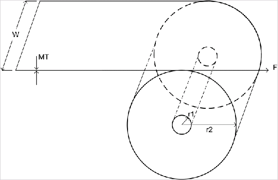 На следующем рисунке показано физическое представление ПРС, где W - ширина валка, r1 - радиус сердечника, r2 - радиус валка и MT - толщина материала.