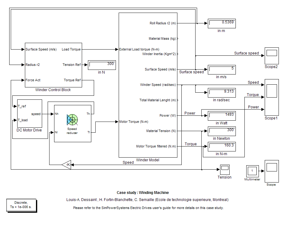 Имитационная модель намоточной машины содержится в файле cs_winder. Параметры моделирования - это параметры приложения намотки бумаги, где ширина рулона равна 10 м. Откройте файл и посмотрите на параметры в масках Simulink блока модели ПРС, блока управления ПРС, блока привода двигателя постоянного тока и блока редуктора скорости. В блоке управления ПРС вы увидите, что уставка натяжения составляет 300 Н, а уставка скорости поверхности - 5 м/с.