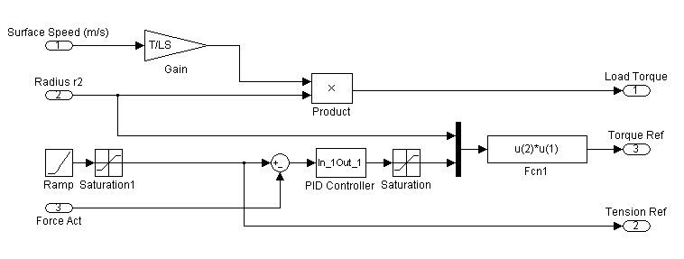 Этот блок содержит PID-контроллер, который регулирует натяжение, прикладываемое к материалу обмотки. Выходной сигнал этого регулятора силы является контрольной точкой крутящего момента для привода двигателя ПРС. Блок управления ПРС, показанный в блоке управления ПРС, также содержит характеристику зависимости натяжения от скорости внешнего процесса подачи материала на ПРС с постоянной скоростью. Эта характеристика состоит в прямой линии наклона, равной отношению натяжения эталонного материала к постоянной скорости поверхности.