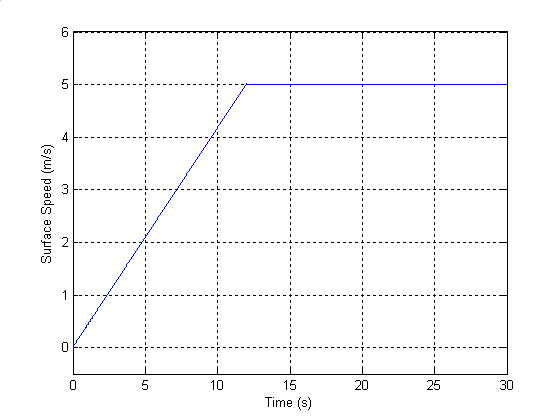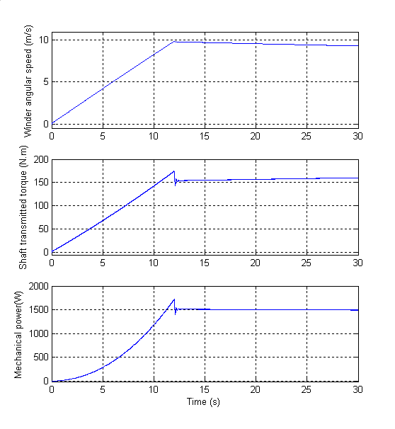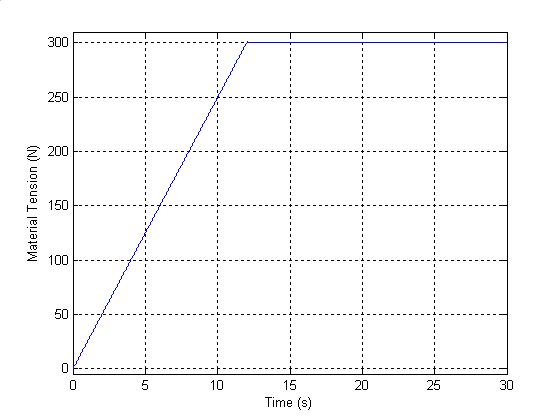 Скорость изменения уставки натяжения внутри ограничена 25 Н/с, так что уставка натяжения требует 12 с для достижения ее конечного значения. Обратите внимание, что шаг времени моделирования полной модели составляет 1 мкс, чтобы соответствовать редуктору скорости, который является блоком, требующим наименьшего шага времени моделирования.