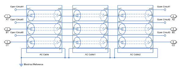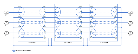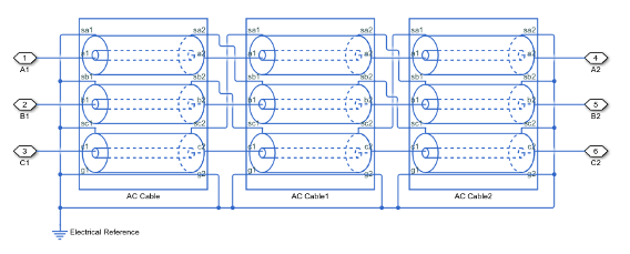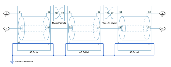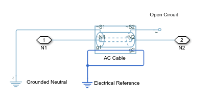Блок кабеля переменного тока (трехфазный) включает в себя индуктивности и взаимные индуктивности между каждой фазой, оболочкой и обратной траекторией. Поэтому можно подключить идеальный электрический опорный блок к обоим портам возврата, g1 и g2, сохраняя при этом моделирование потерь в линии возврата «Земля» или «Нейтраль».