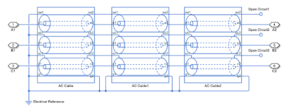 Можно также моделировать перекрестные кабели с помощью блока «Кабель переменного тока (трехфазный)».
