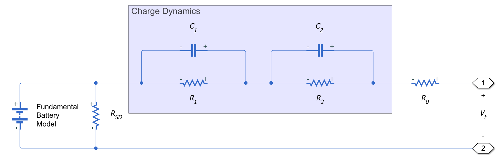 R1 и R2 являются параллельными RC сопротивлениями. Задайте эти значения с параметрами Первое поляризационное сопротивление, R1 (SOC, T) и Второе поляризационное сопротивление, R2 (SOC, T), соответственно, если параметры табулируют по температуре или Первое поляризационное сопротивление, R1 (SOC) и Второе поляризационное сопротивление, R2 (SOC) в противном случае.