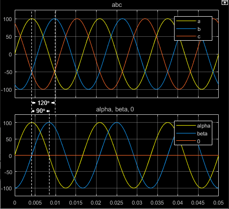 Блок преобразования Кларка преобразует компоненты временной области трехфазной системы в опорном кадре abc в компоненты в опорном кадре стационарного ɑβ0. Блок может сохранять активные и реактивные мощности с мощностями системы в опорном кадре abc, реализуя инвариантную версию мощности преобразования Кларка. Для сбалансированной системы нулевая составляющая равна нулю.