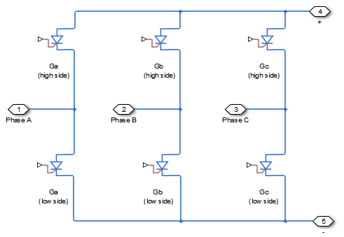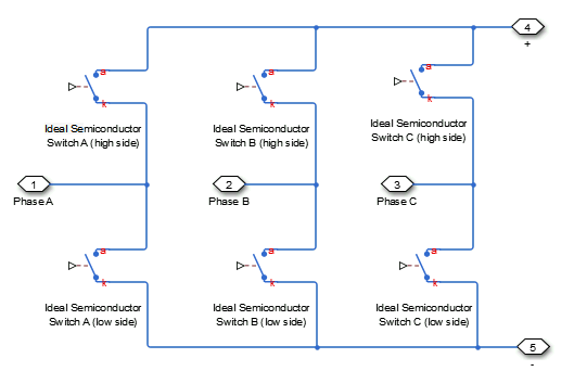 Каждый компонент в цепи с тремя рычагами является одним и тем же коммутационным устройством, которое задается с помощью опции в диалоговом окне Блок преобразователя (трехфазный). Коммутационные устройства, которые можно указать, представляют собой реализации блоков в библиотеке Simscape > Electrical > Semiconductors & Converters > Semiconductors.