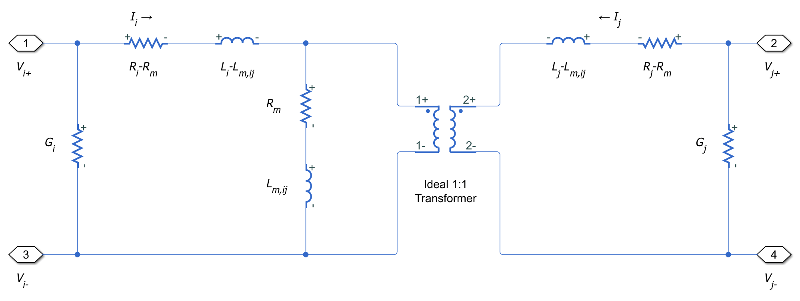 Эквивалентная схема показывает связь между двумя произвольными фазами i и j. Блок моделирует магнитную связь, используя такую эквивалентную цепь между каждой из трех фаз a, b и c.