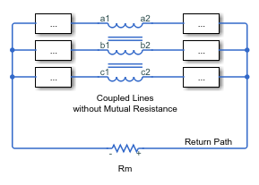 Если три линии имеют общий путь возврата, можно смоделировать сопротивление этого пути возврата с помощью параметра Взаимное сопротивление Rm. Этот рабочий процесс эквивалентен установке взаимного сопротивления в нуль и явному моделированию сопротивления обратного пути Rm, как показано на этой диаграмме.