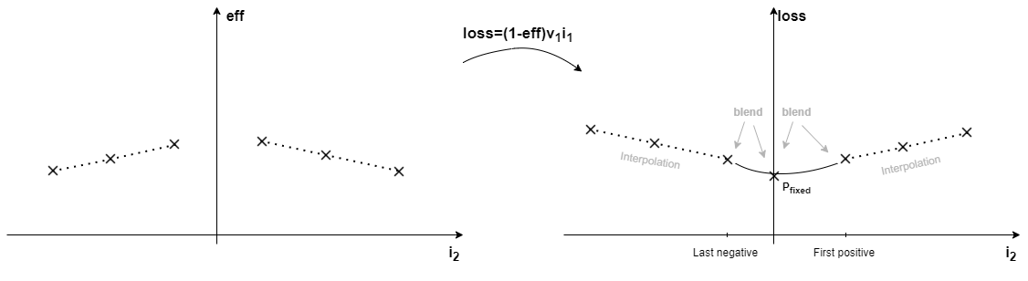 Если выходной ток меньше, чем последняя отрицательная точка тока, или больше, чем первая положительная точка тока в векторе выходных токов для параметра I в таблице эффективности, блок использует параметр Percent efficience, eff (I), чтобы найти соответствующую эффективность (с линейной интерполяцией или ближайшей экстраполяцией) и затем преобразовать эту эффективность в потери.