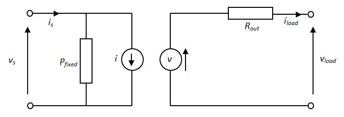 Значение i источника тока вычисляется так, чтобы мощность, поступающая в преобразователь, равнялась сумме мощности, вытекающей из преобразователя, плюс потери преобразователя.